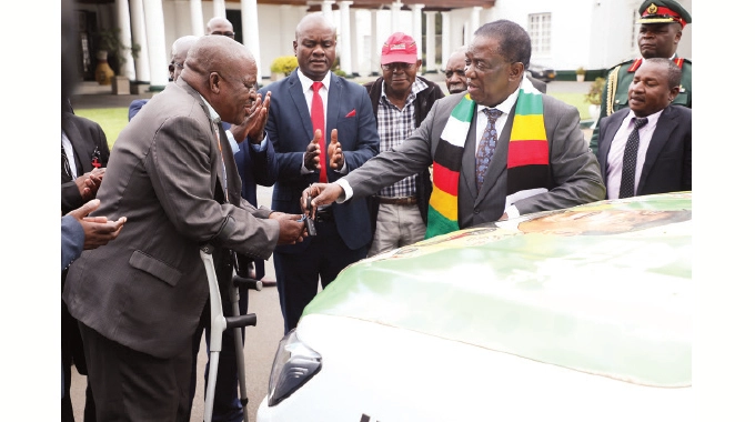 President Mnangagwa hands over car keys to Clr Patrick Mukahanana at State House in Harare yesterday. The President handed over vehicles to Zanu PF Councillors with Disabilities. The beneficiaries are councillors from Sanyati, Vungu and Mutasa Rural District Councils. - Picture: Believe Nyakudjara.