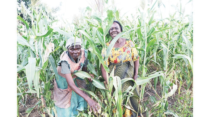 Ms Sithokozile Murengi (68) (left) and Ms Reigina Ncube at their maize field in Mpopoma suburb yesterday